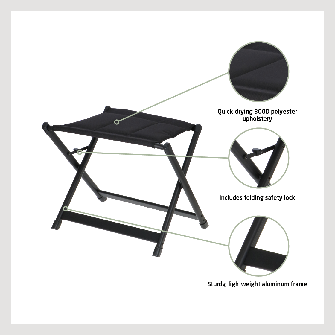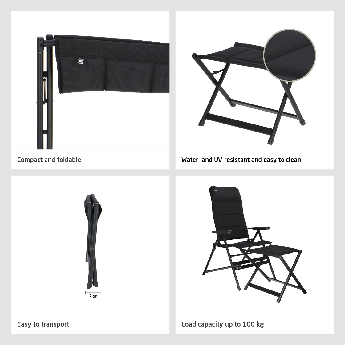 Vervollständigen Sie Ihren Entspannungsmoment mit dem Travellife Festo Fußhocker in Graphitschwarz. Dieser Fußhocker mit schnell trocknendem Polyesterbezug ist der ideale Ort, um Ihre Füße auszuruhen. Kombinieren Sie den Fußhocker mit dem Festo Stehstuhl und Sie haben ein komplettes Set.