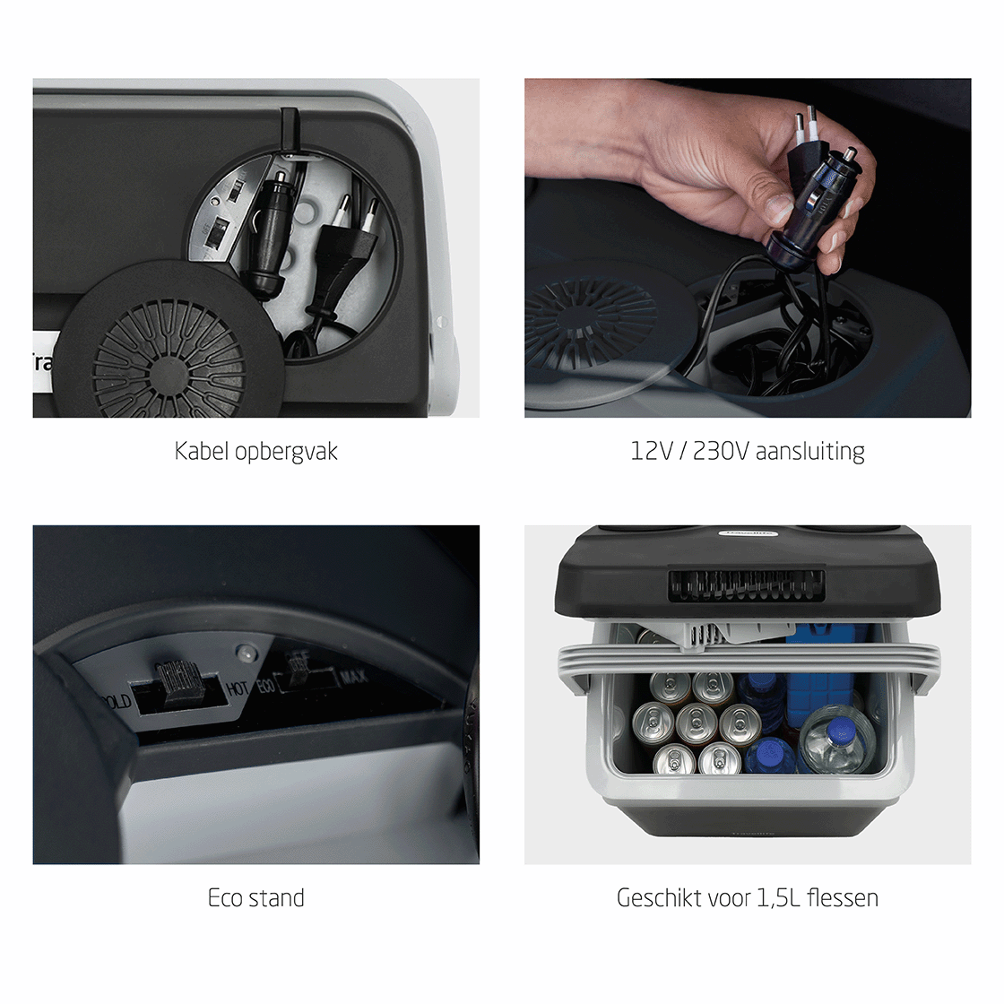 Your holiday starts when you hit the road. Connect the Travellife cool box with the included car plug and enjoy chilled or hot drinks in the car. The length of the connecting cables is 175 cm for both connection voltages. Thanks to the handy storage compartment in the lid, you can easily store the cords. With its large 19 L capacity, the cool box is suitable for 1.5 L bottles. This allows you to take plenty of food and drink with you anytime, anywhere.