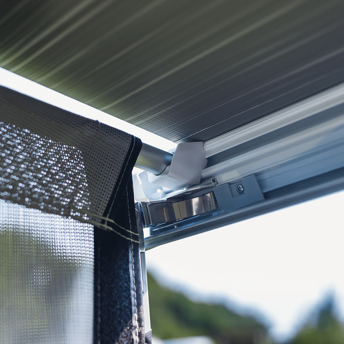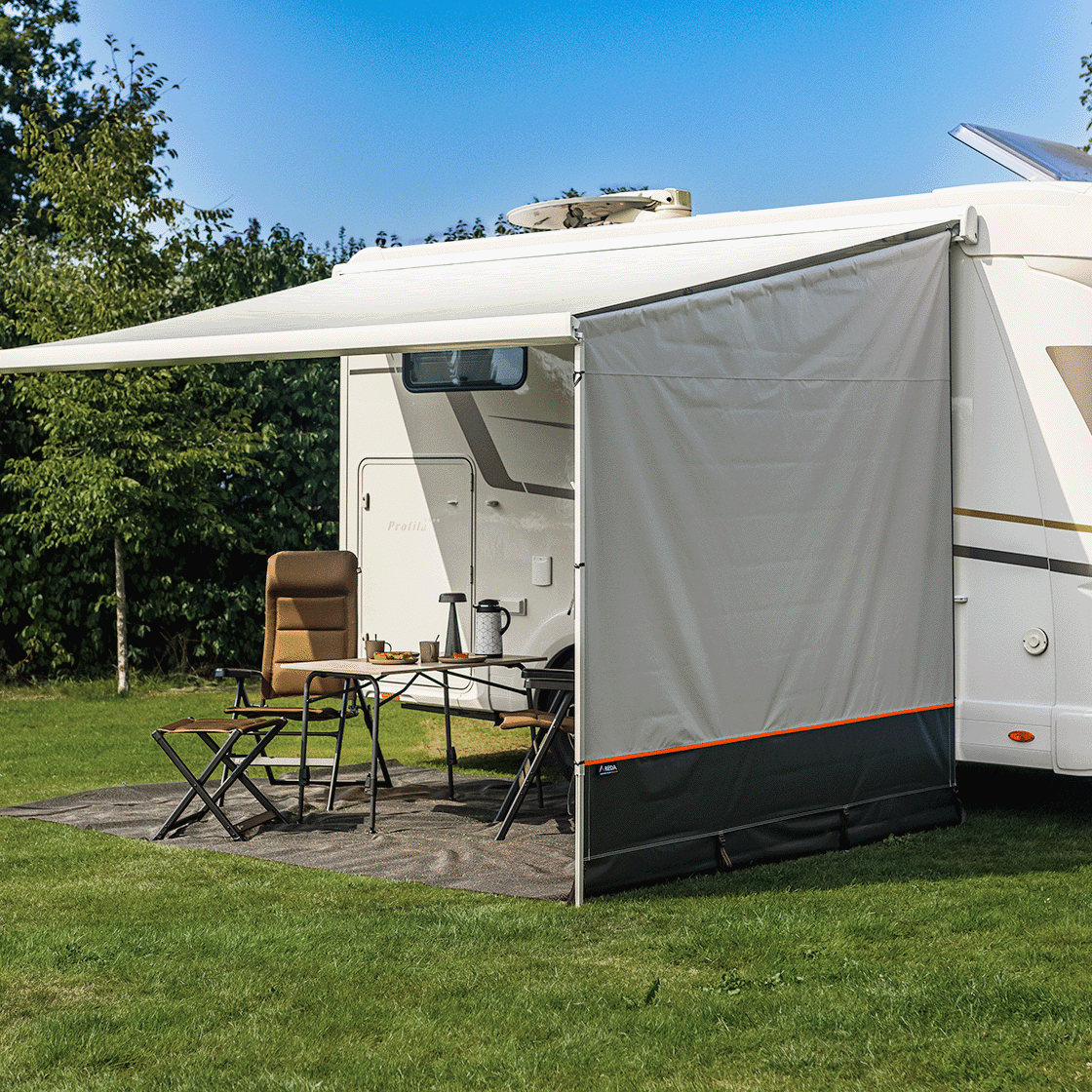 Le pareti laterali Adventure sono disponibili nelle versioni sinistra e destra. Per determinare la destra e la sinistra, guardare verso la roulotte o il camper. La parete laterale è completa di barra portante, set di tensionamento e manuale. Desiderate un'installazione ancora più salda e aderente alla parete della roulotte o del camper? Allora amplia la parete laterale Adventure Side 250 con il set di collegamento Adventure Side Wall Connection Set. Questo set è composto da un cuscino di collegamento con velcro e una barra di pressione regolabile in alluminio da 25 mm. Insieme garantiscono un collegamento pulito e senza spifferi. La parete laterale è disponibile anche con finestra o tessuto a rete.