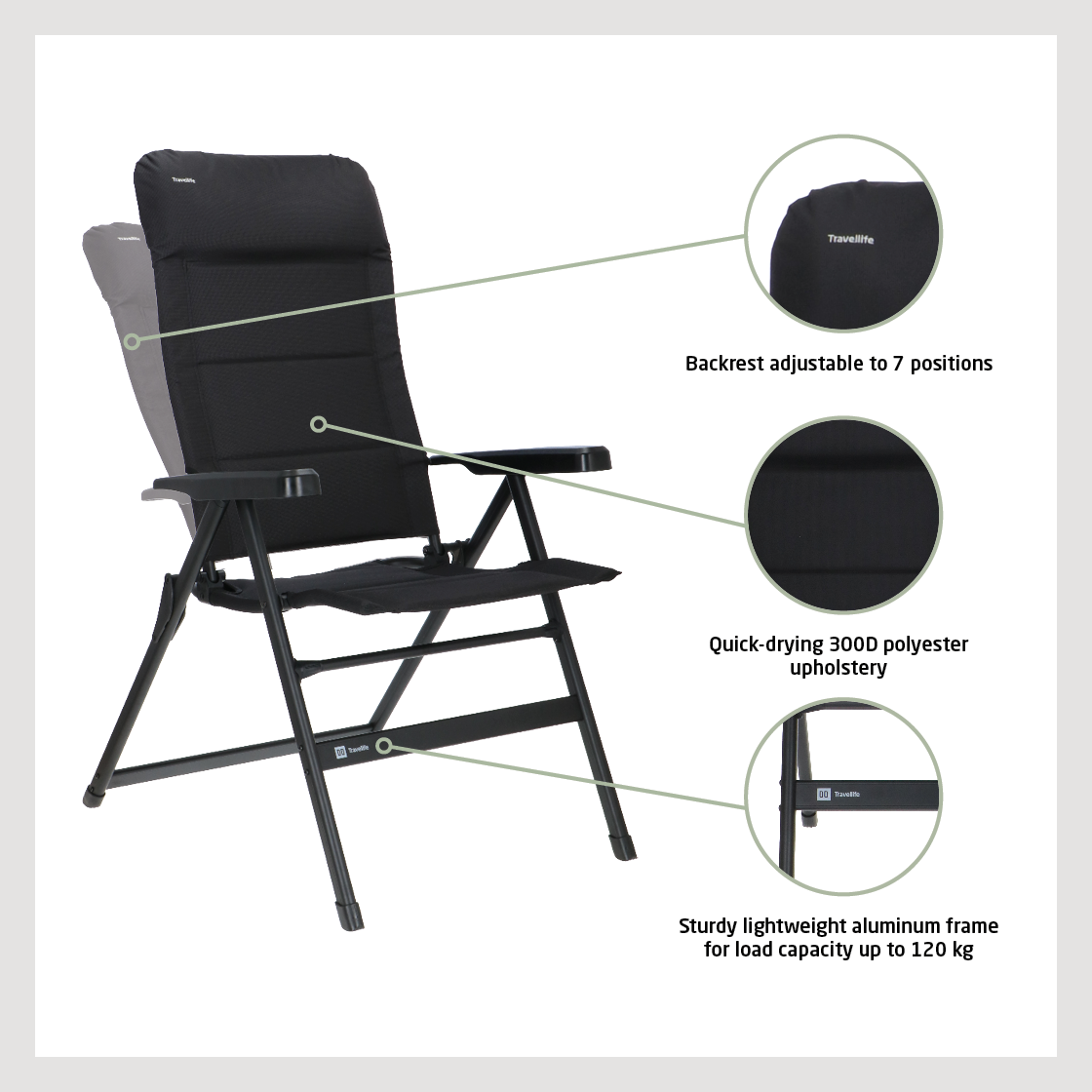 Geniet van elk buitenmoment met de Travellife Festo standenstoel L graphite black: een comfortabele campingstoel die exclusief online verkrijgbaar is. Ook beschikbaar in XL-variant met groter zitvlak en verhoogde rug- en armleuningen.