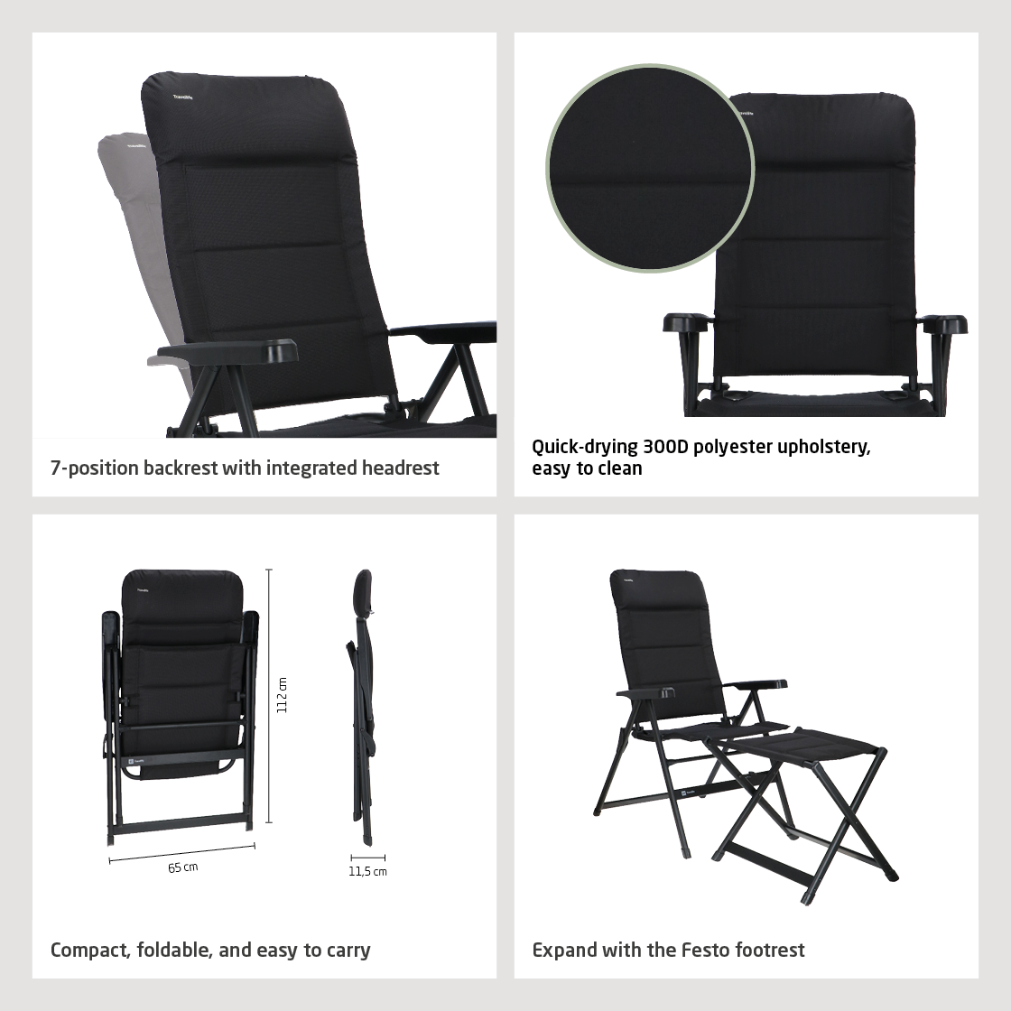 De Festo is water- en uv-bestendig en dus perfect bestand tegen wisselende weersomstandigheden. Dankzij het sterke maar lichte aluminium frame neem je de stoel moeiteloos mee naar de camping. Na gebruik vouw je hem eenvoudig op tot een compact formaat. Combineer de standenstoel met de Travellife Festo voetenbank in de kleur zwart voor nog meer comfort.